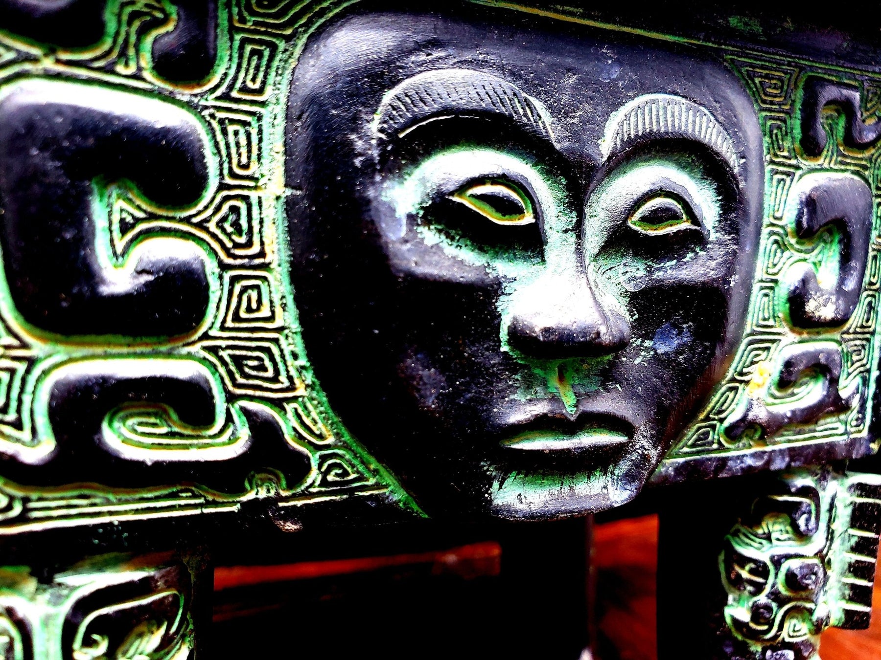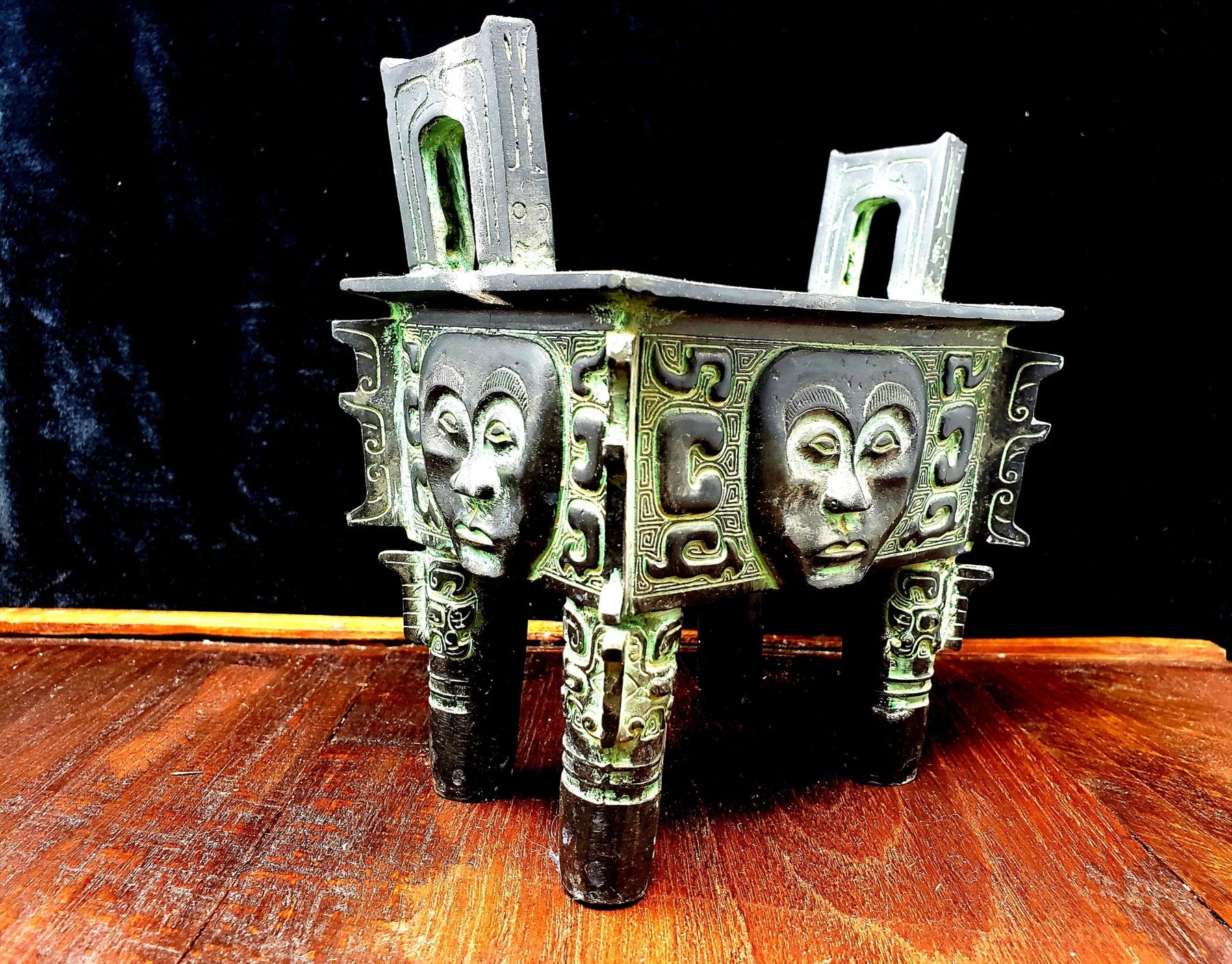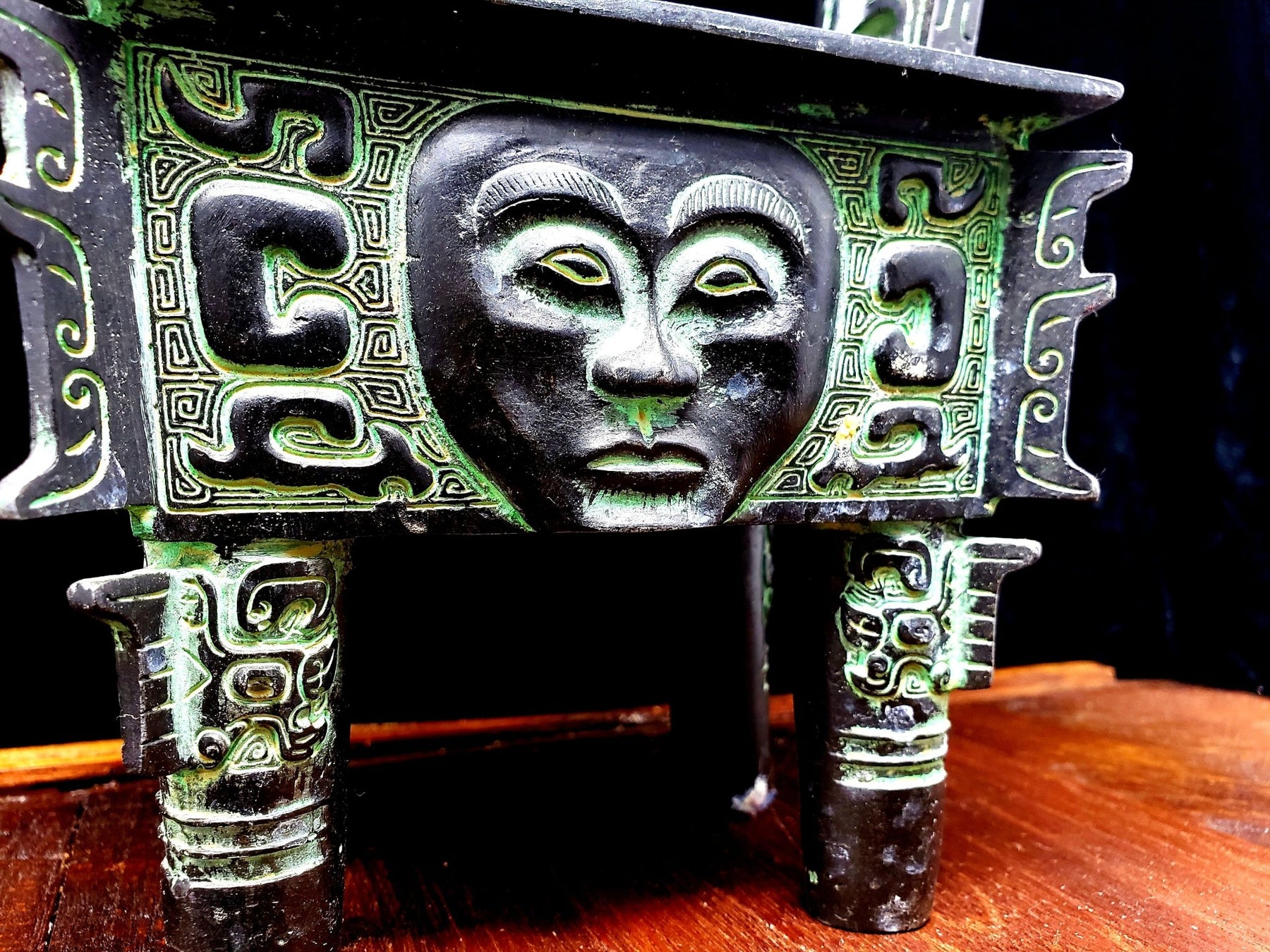 The Da He Ding Cauldron, was an Ancient Chinese Cauldron that was unearthed in Hunan China in 1959. This is a reproduction of that same Cauldron. The original was said to have been made during the late Shang Dynasty (over 3000 years ago!). It is the only Ancient Chinese Cauldron that has been discovered which uses human faces. The inscription reads 'Da He' or 'Great Grain', leading many to believe that the original was used for sacrifices for the harvest.