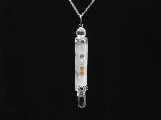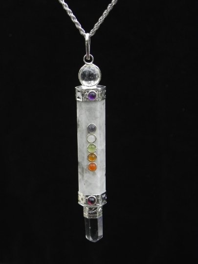 On the top and bottom of the piece are clear quartz crystals. Quartz is believed to broadcast energy. It is well placed on this pendant to broadcast the powerful healing properties of these chakra crystals across your mind, body and spirit.