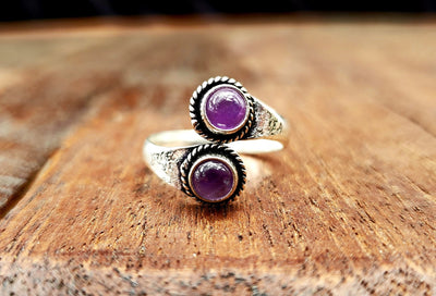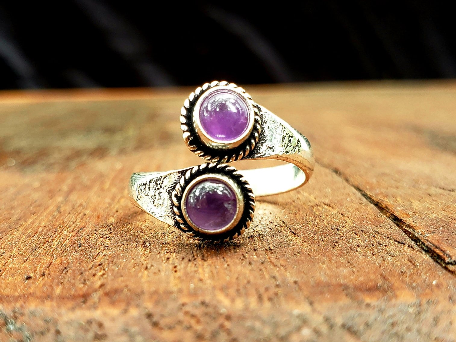 Really cool ring featuring two pieces of genuine amethyst gemstones. Totally adjustable, this ring can easily be made bigger or smaller to fit any ring size. Perfect if your finger swells in hot weather, or after a few strong drinks (or both)