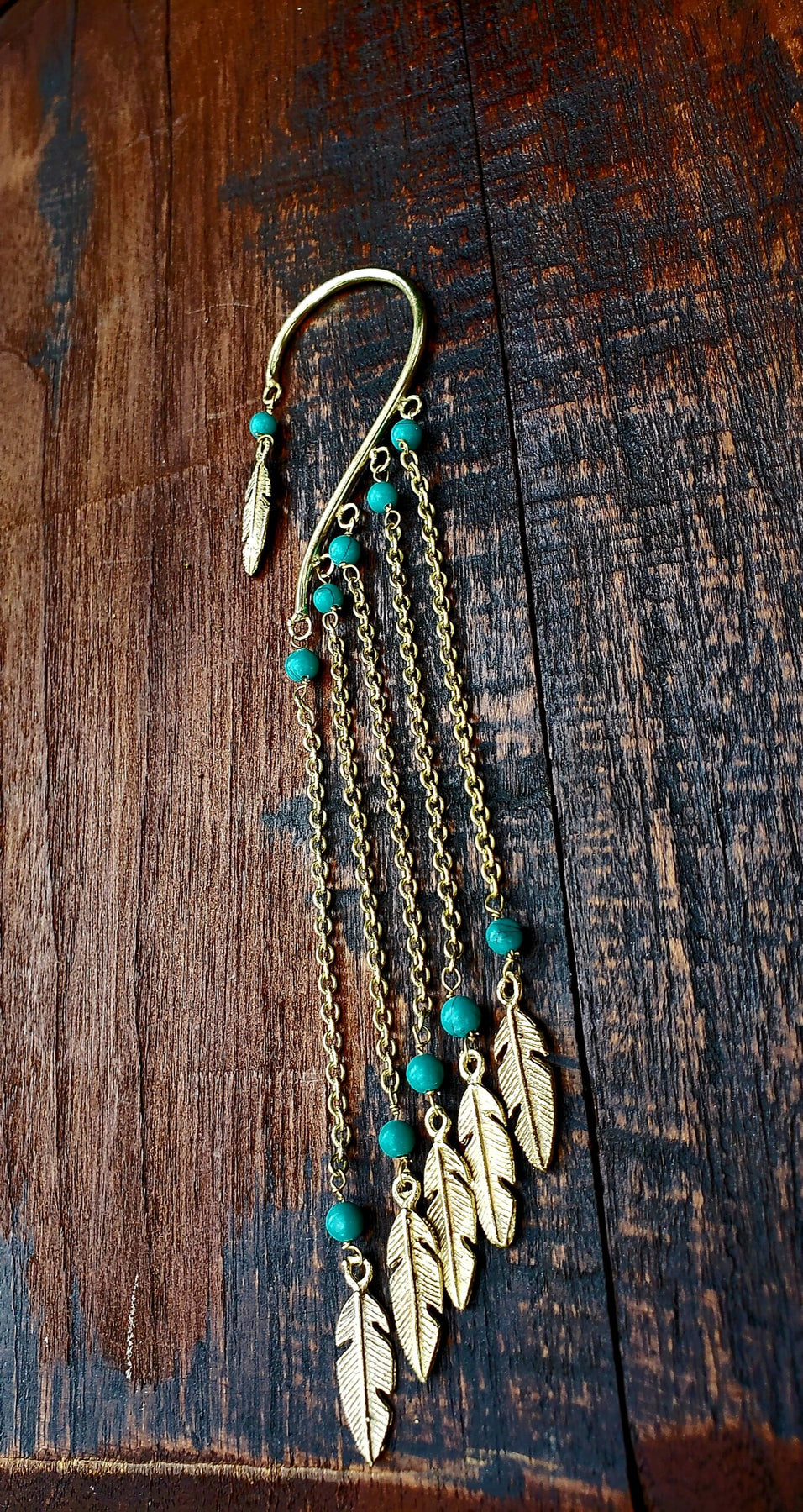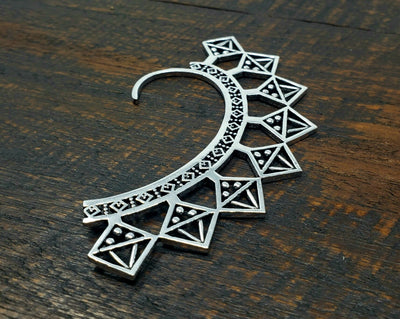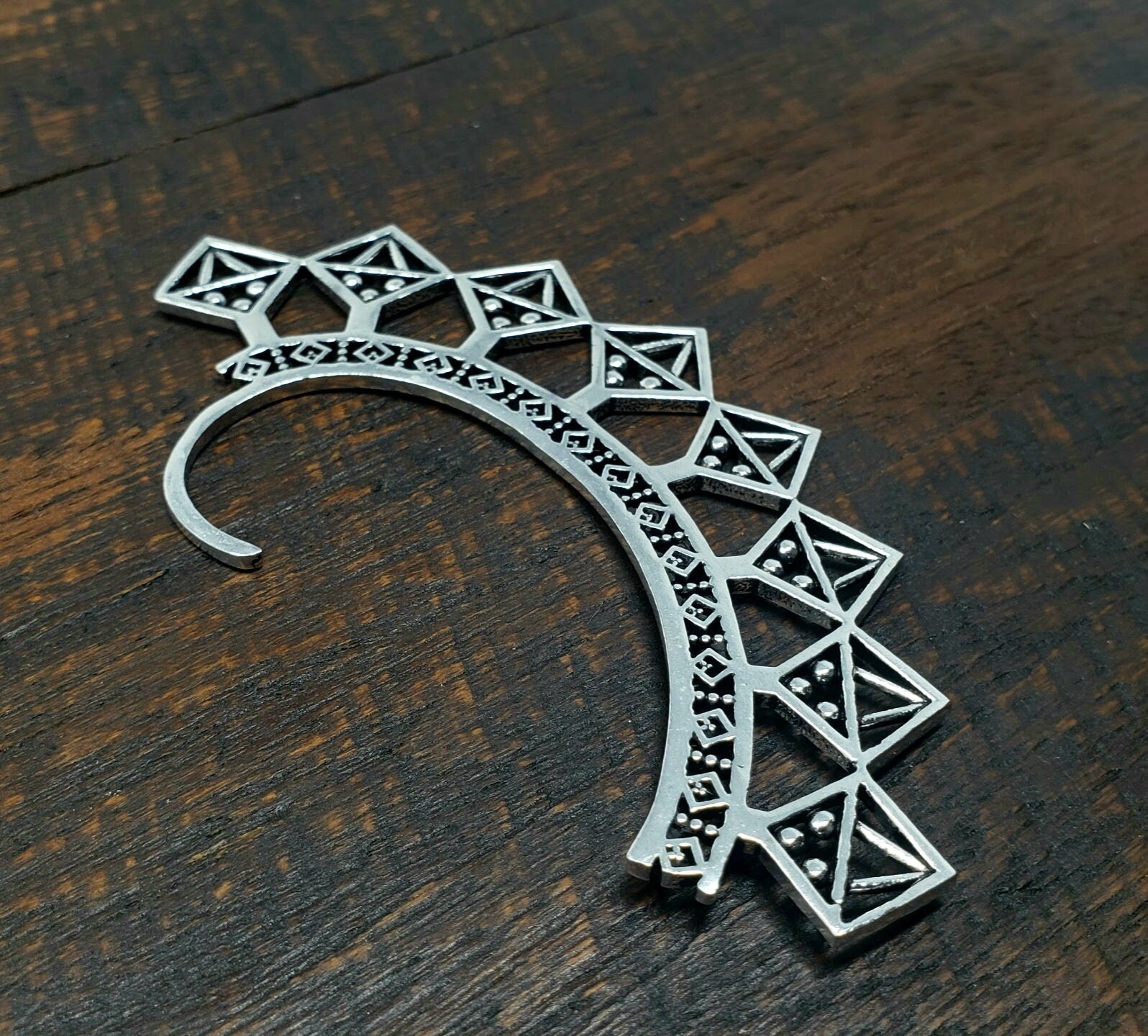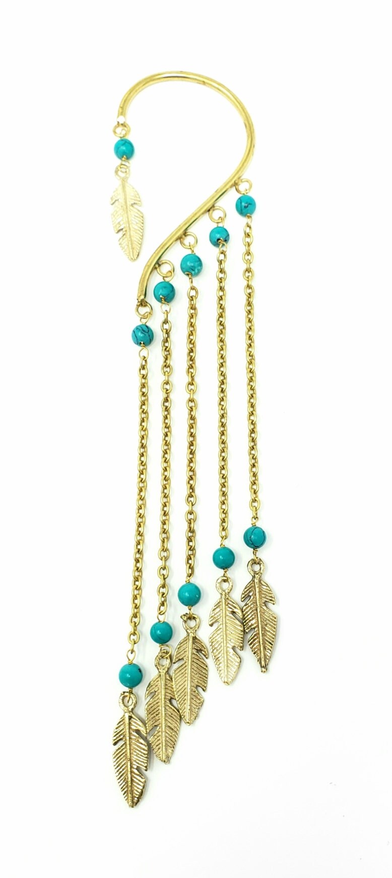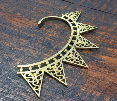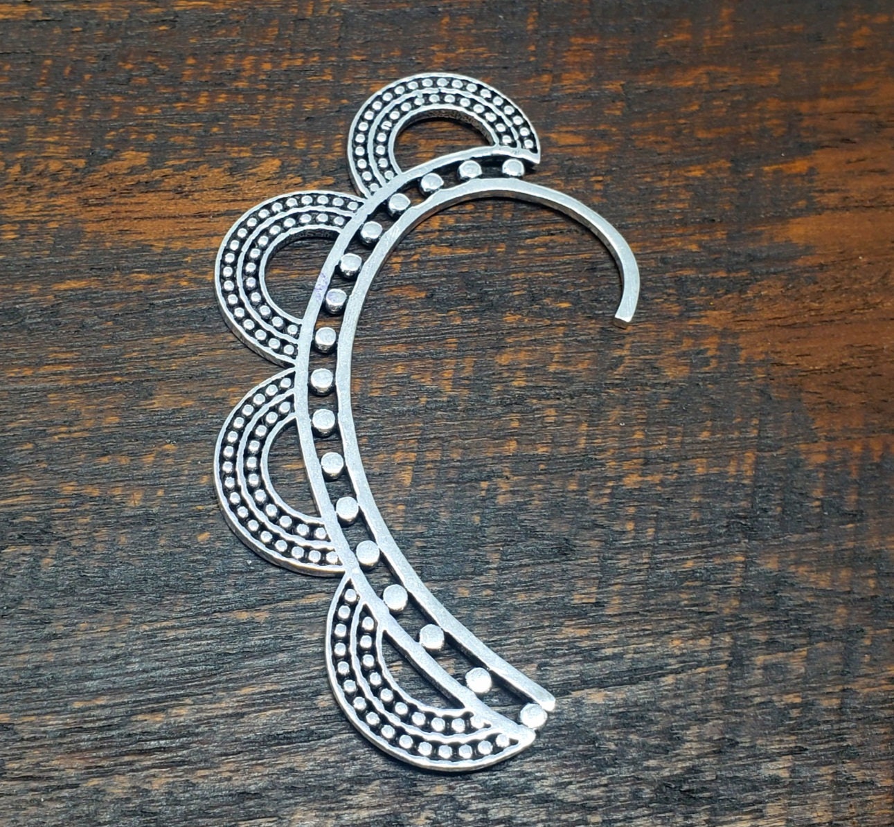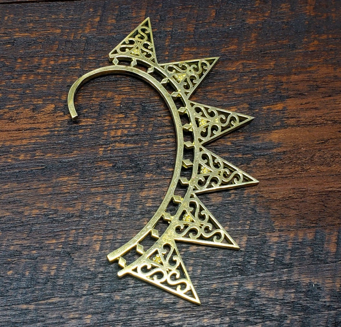 It hangs loosely on the top, but stays on even through festivals and parties. The top piece is adjustable to hug even the smallest of ears. It is double sided and can be worn on either ear. This ear cuff is made from brass. Looks amazing!