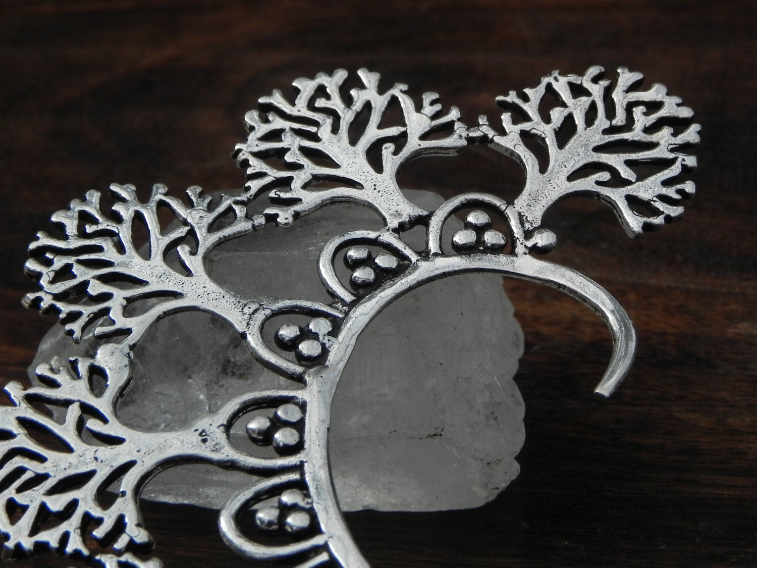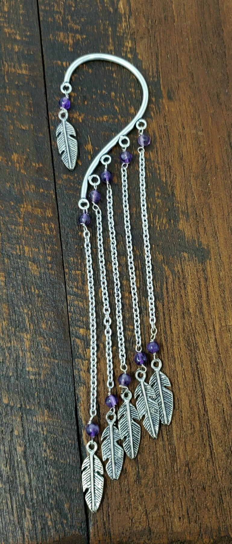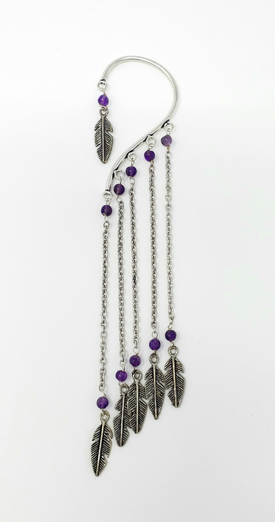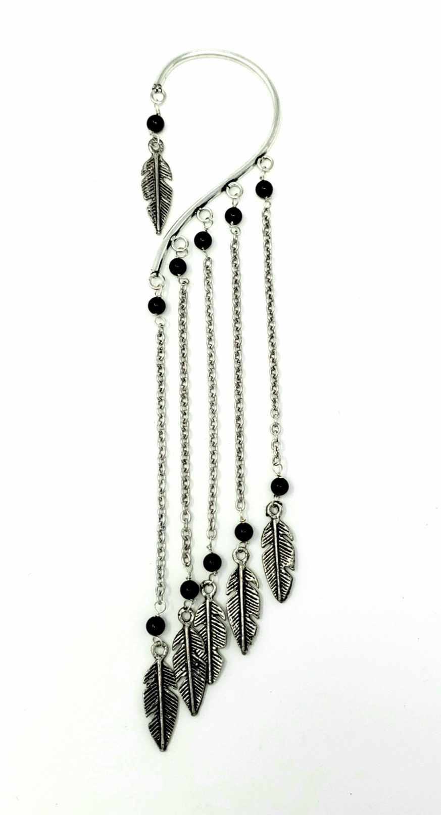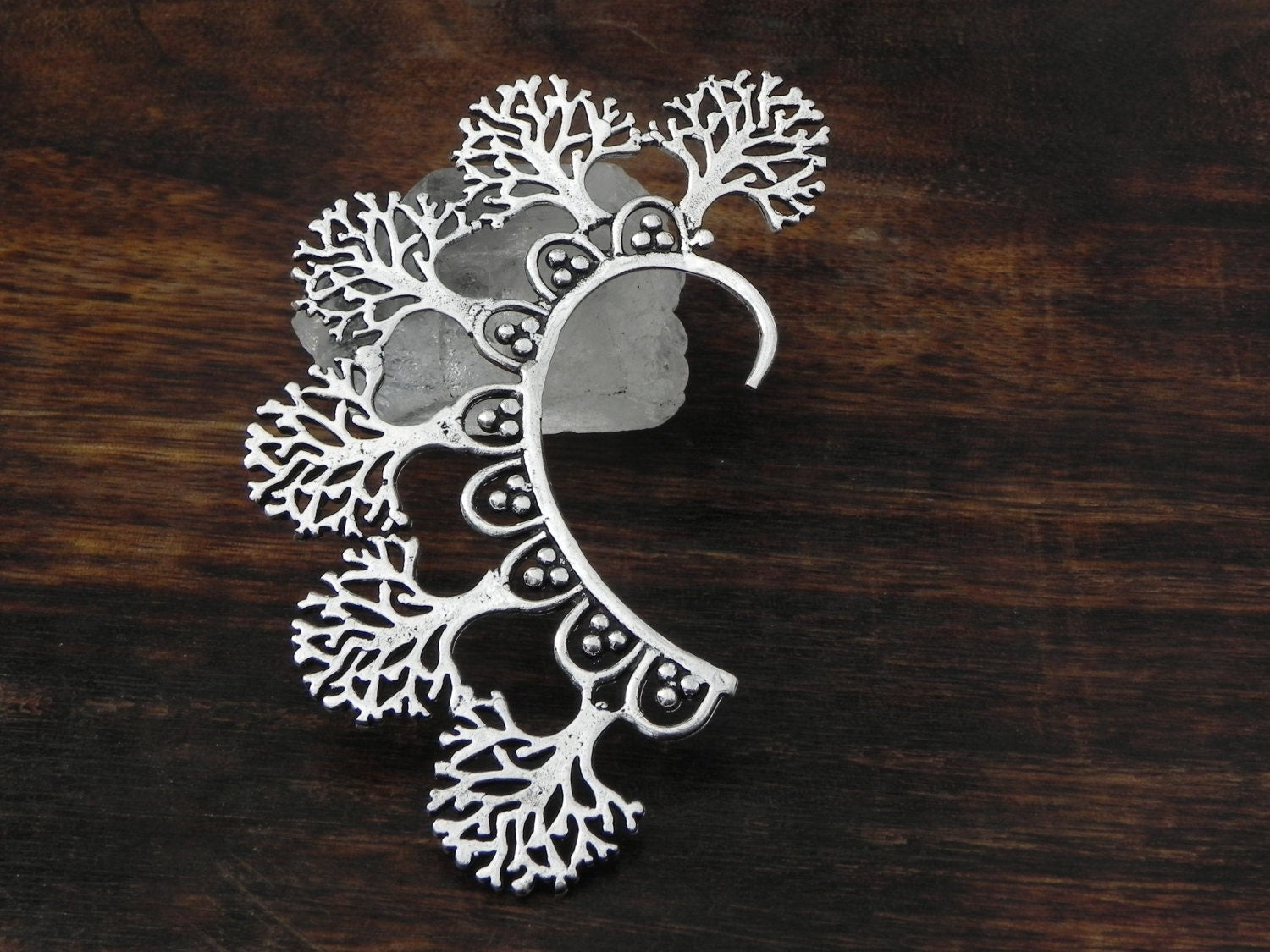 It hangs loosely on the top, but stays on even through festivals and parties. The top piece is adjustable to hug even the smallest of ears. It is double sided and can be worn on either ear. This ear cuff is made from brass. Looks amazing!