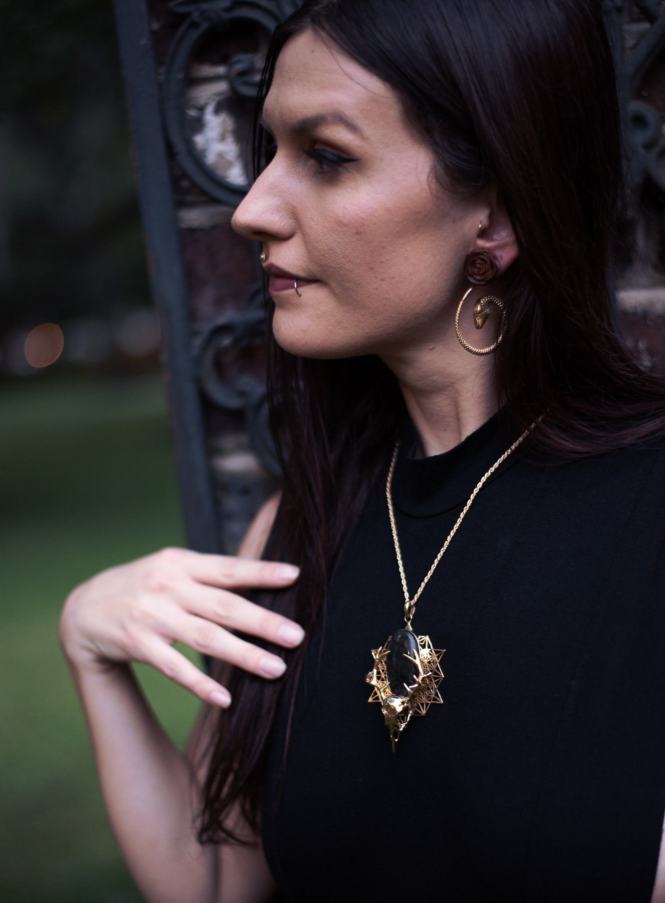 Unique gold tone mandala earrings with five cabochons of Amethyst!