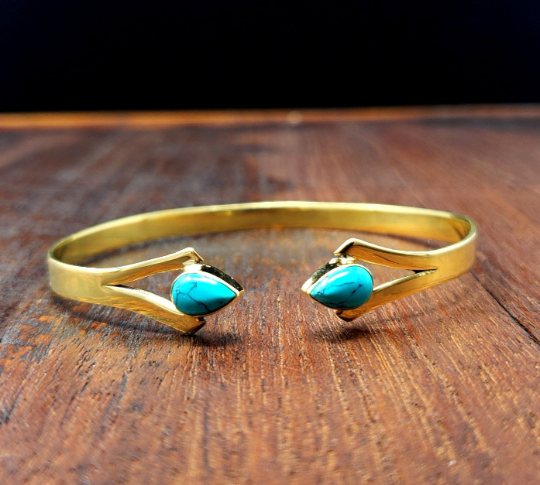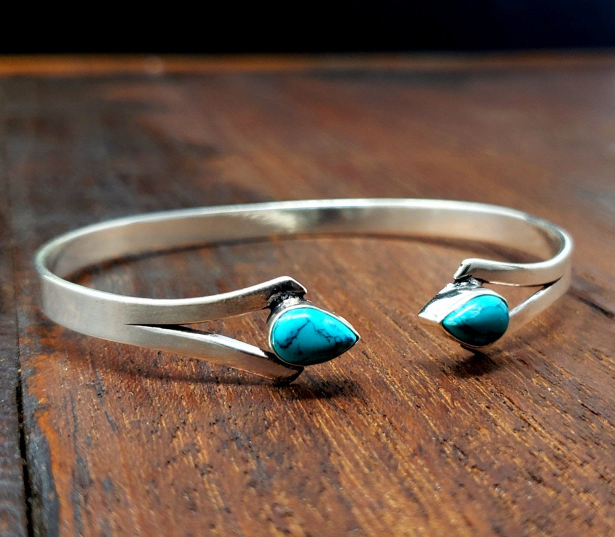 Beautiful and simple turquoise dagger bangle bracelet with two pieces of turquoise.
