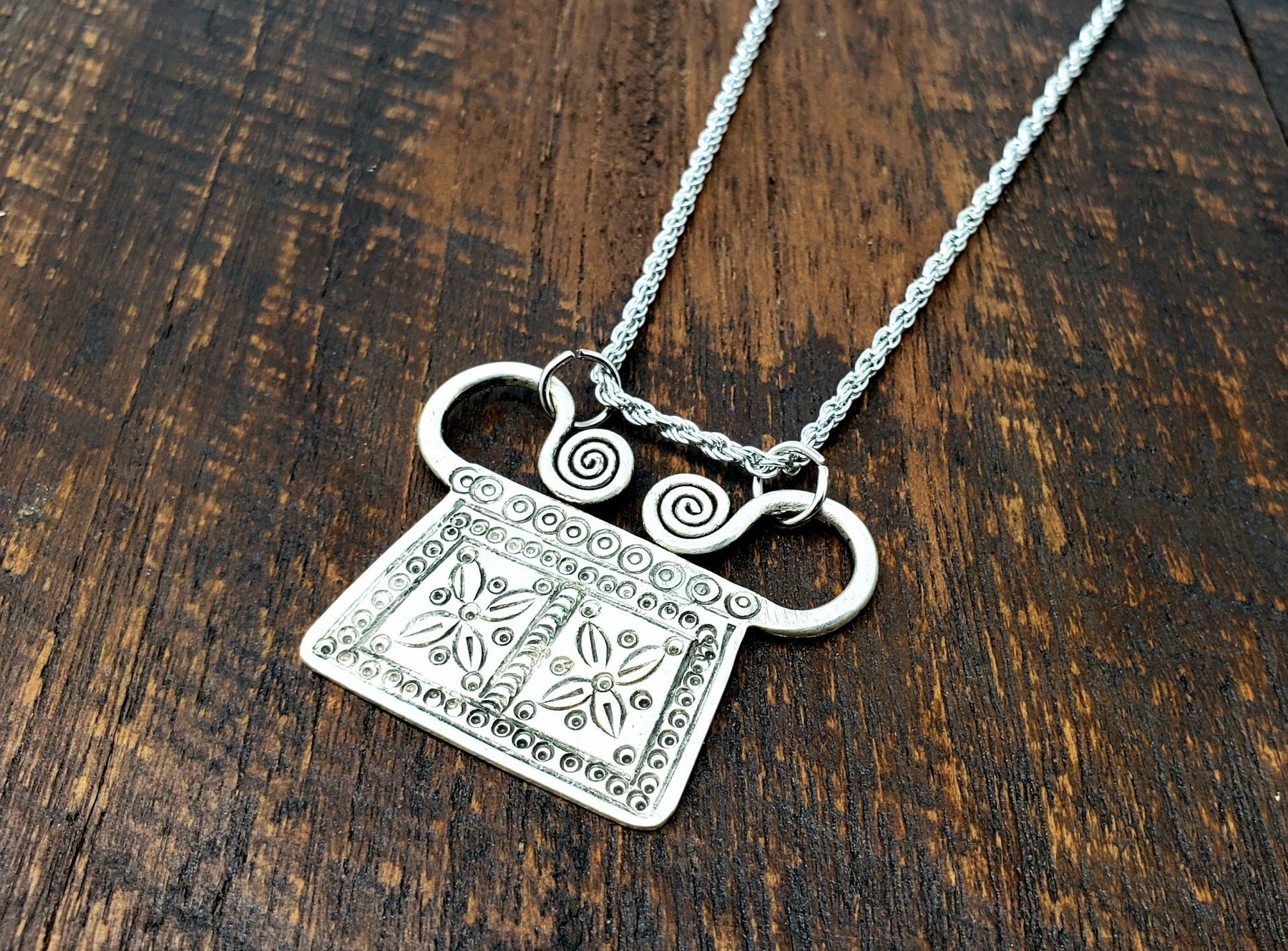 This type of pendant is traditionally worn to "lock in" your spirits. In the traditional Hmong culture, it is believed that people have eleven spirits, and when one or more of these spirits leaves the body then it causes bad luck and misfortune, or bad health. Wearing this necklace is believed to keep your spirits within you for protection and good luck.