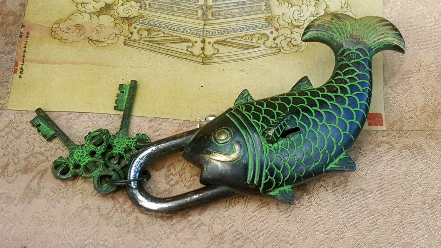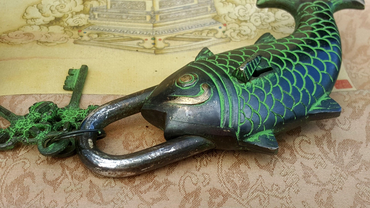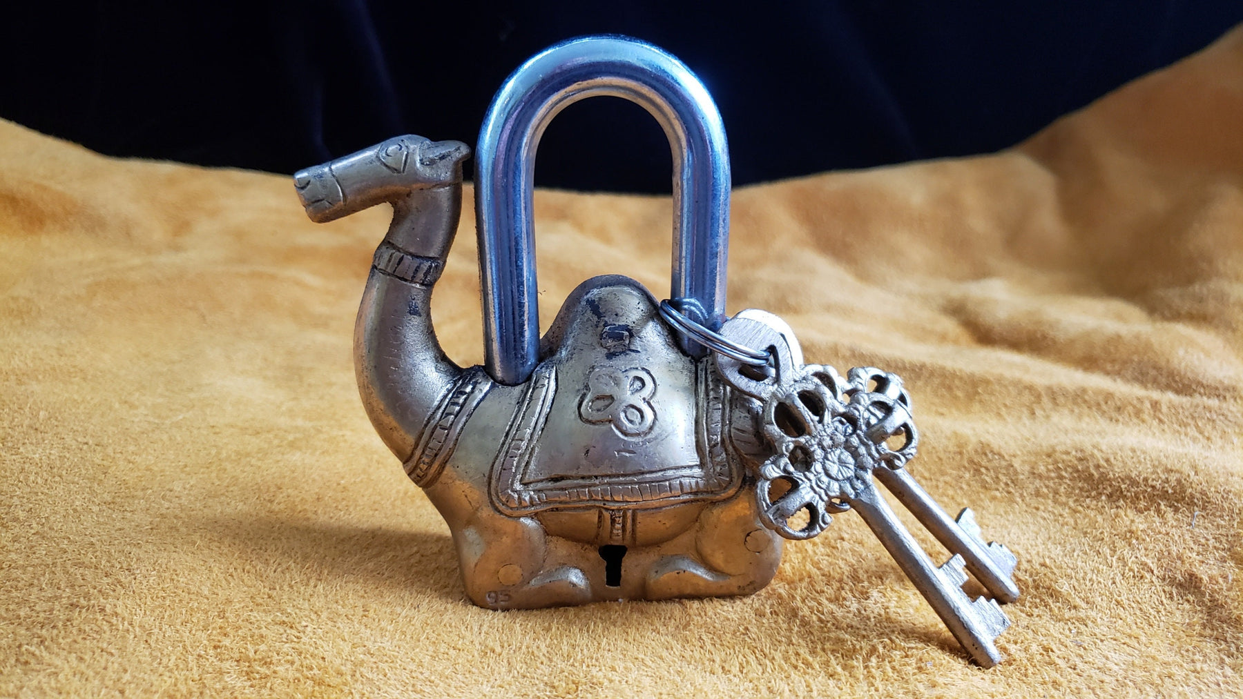 This is an original Hindu temple Ganesh lock that we collected from the ancient city of Kathmandu, Nepal. The skeleton keys are artifacts in their own right, and are unique to the lock.