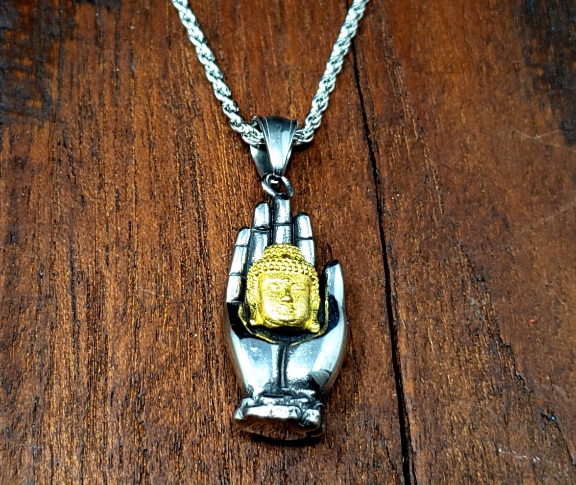 This pendant features a golden Buddha resting in a silver Abhaya mudra hand.