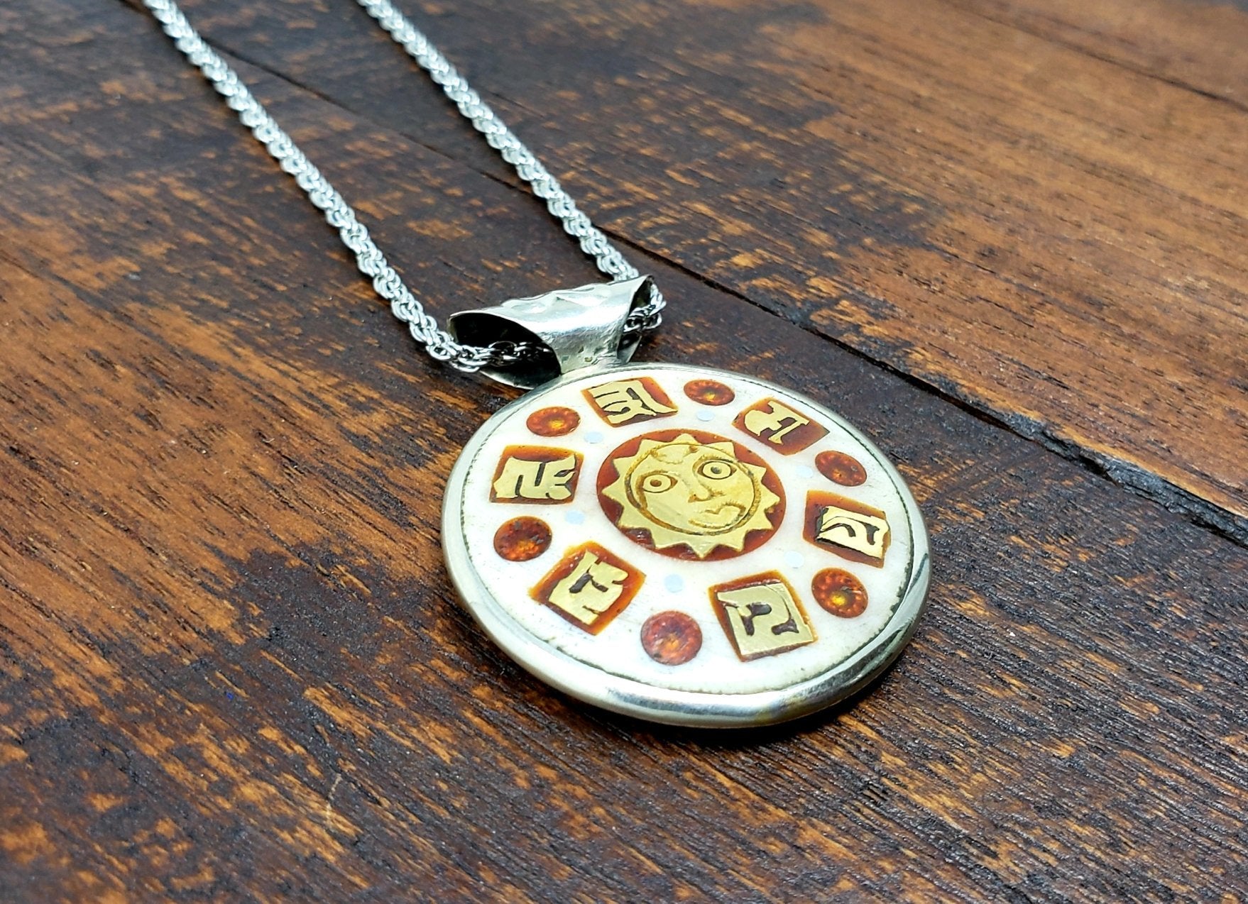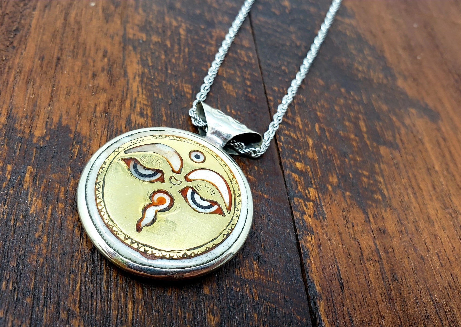 This pendant was collected by us from the Tibetan communities in Nepal during our trip to the Himalayas. Made by hand by skilled Tibetan artisans with high quality tarnish resistant jewelry brass. Measures 1.25" x 1.25". Comes with your choice of chain or cord. This has been popular with men and women.