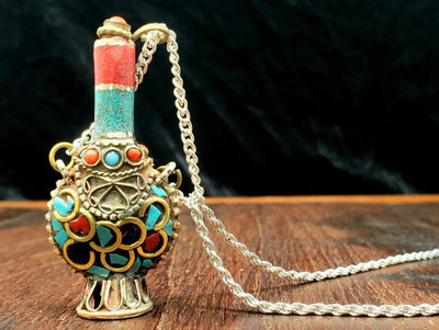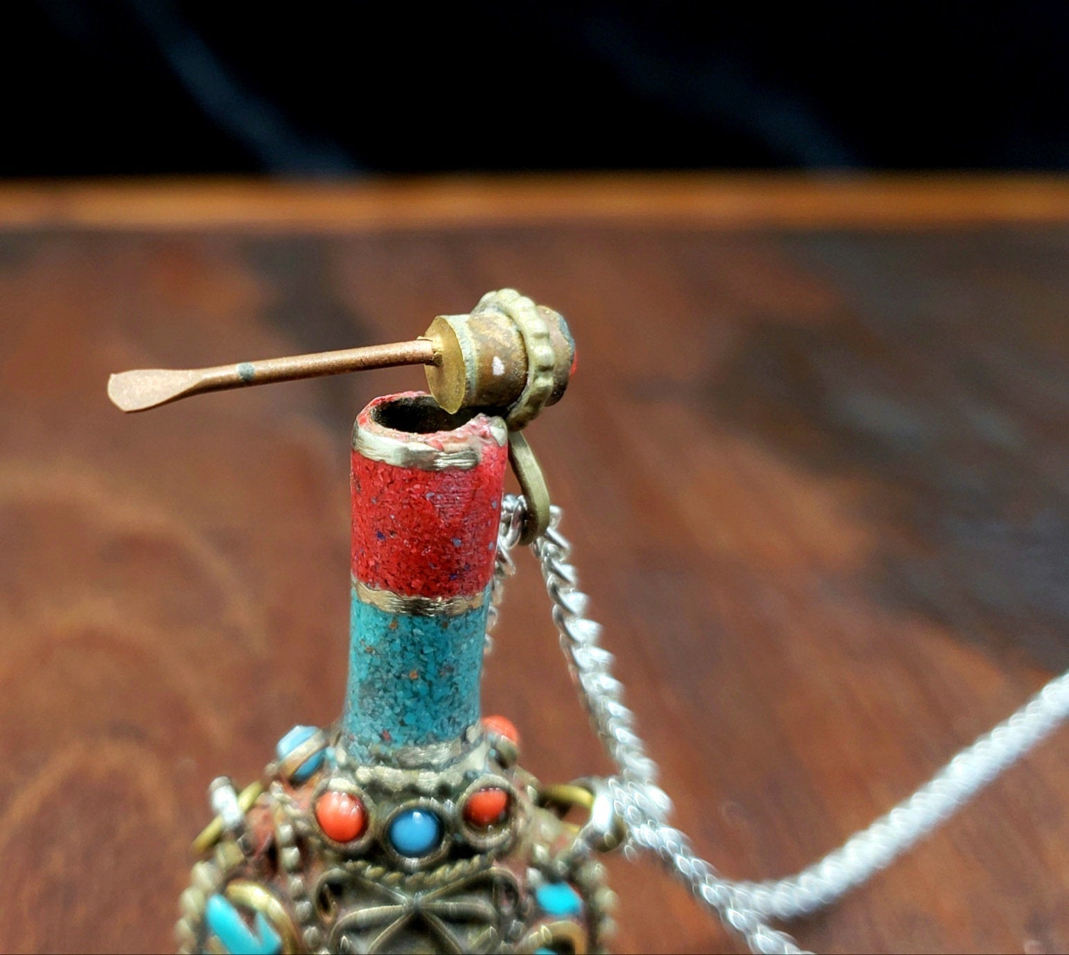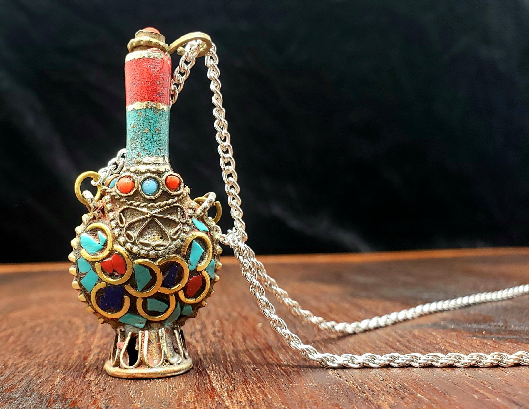 Absolutely beautiful perfume bottle pendant necklace with gemstone inlay.