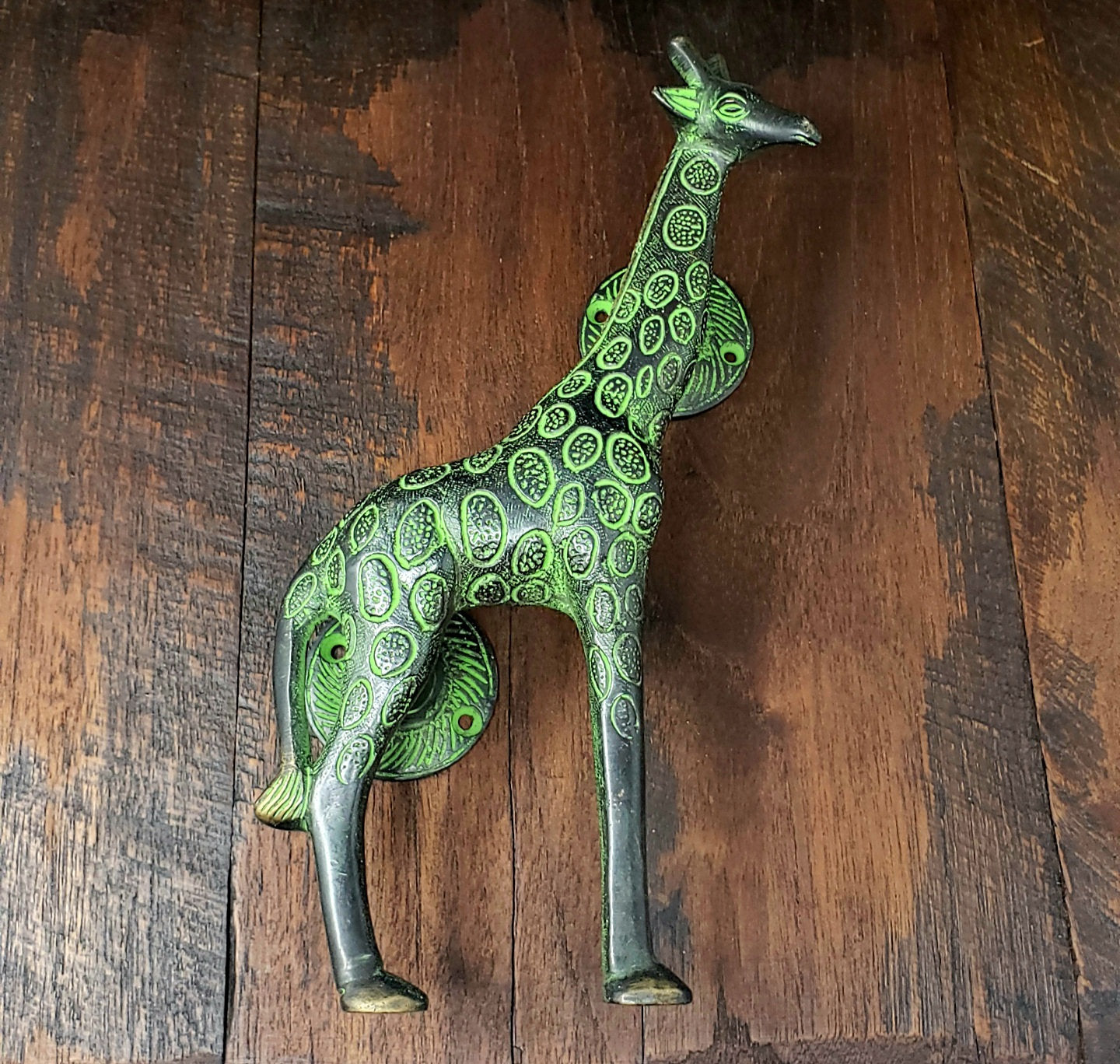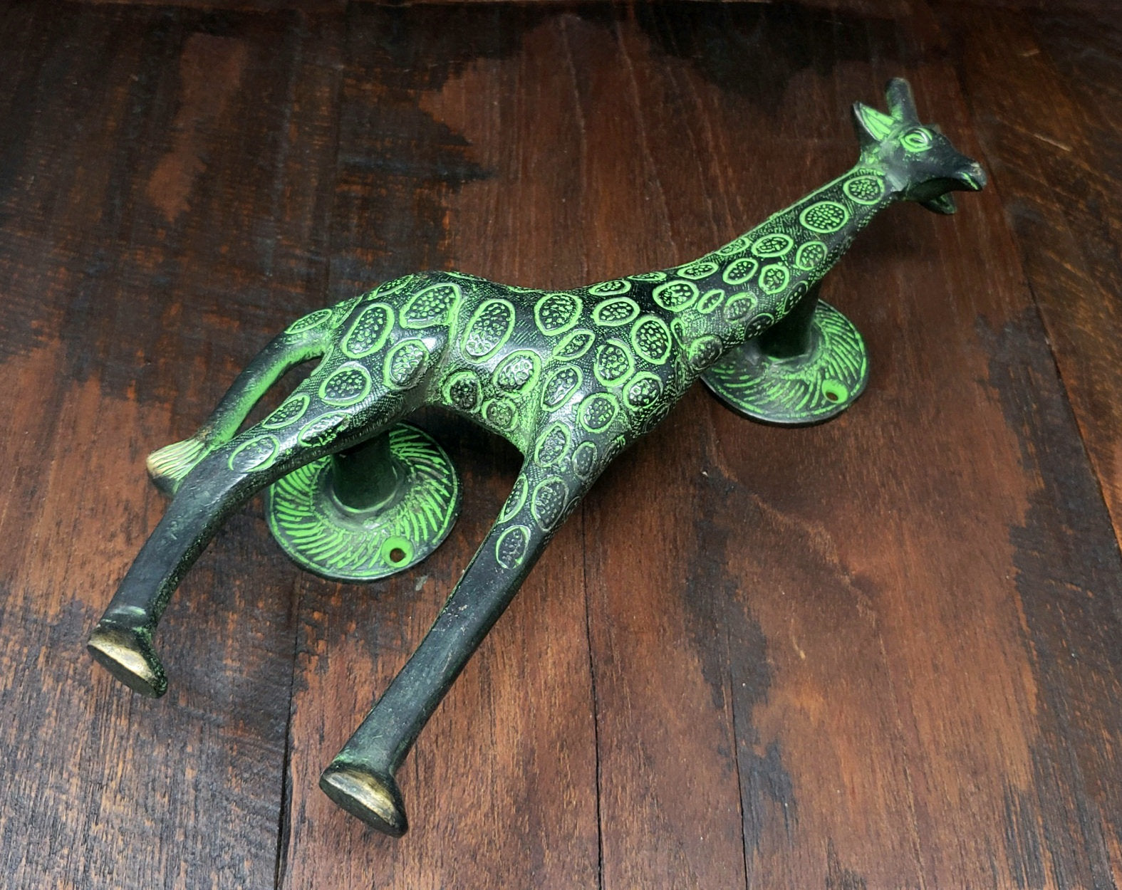 This is a giraffe door handle that we collected from the ancient city of Kathmandu, Nepal.
