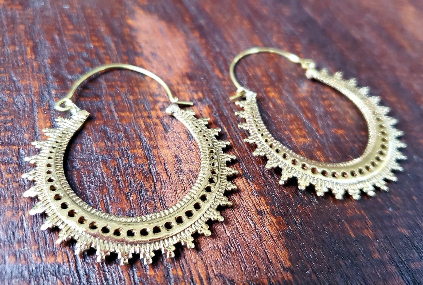 These are made with high quality jewelry brass. Thin and lightweight for daily use. They hang approximately one inch below the ear lobe.
