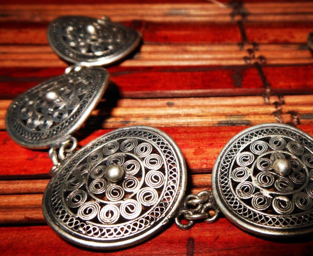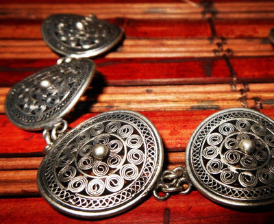 This bracelet is made from used vintage earring pieces. The original earring pieces were large plugs for wide gauged ears, traditionally worn by the Miao Hmong women. When one side of an earring piece breaks the other side is used in other jewelry pieces such as this bracelet.