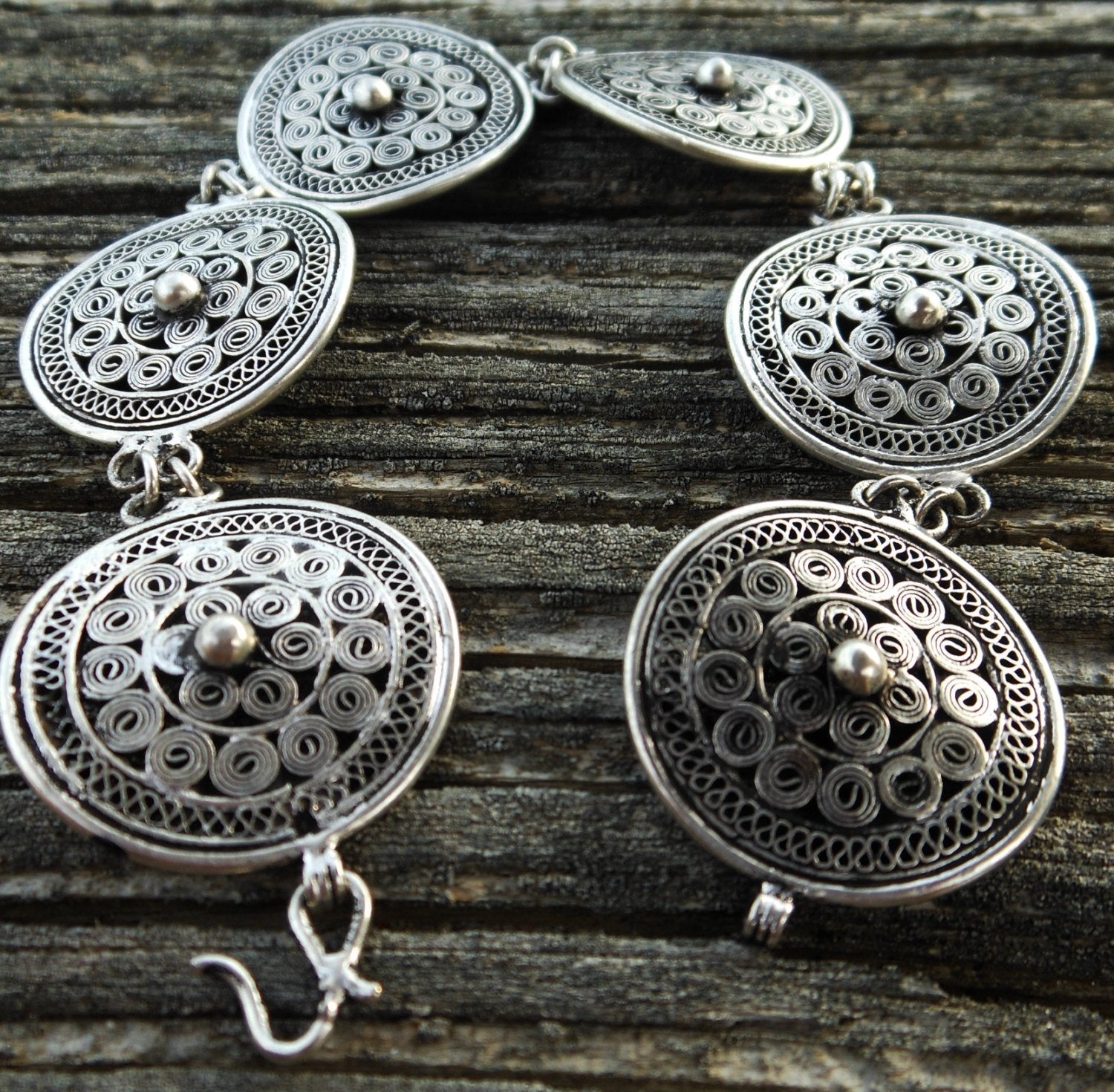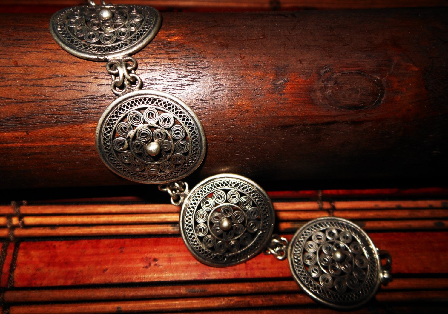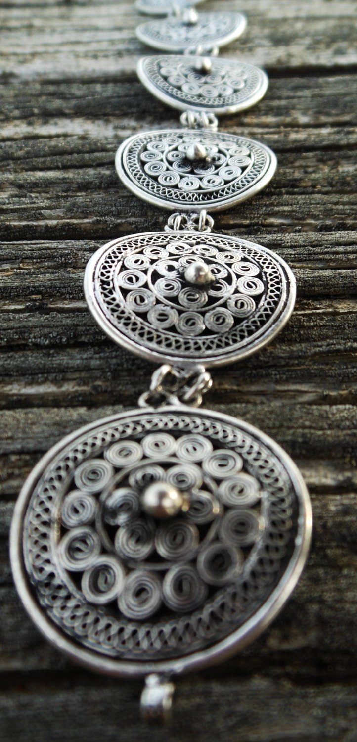 Each segment is made from delicately wrapped silver wire. The metal is a mixture of silver and brass, metal traditionally used by this tribe.