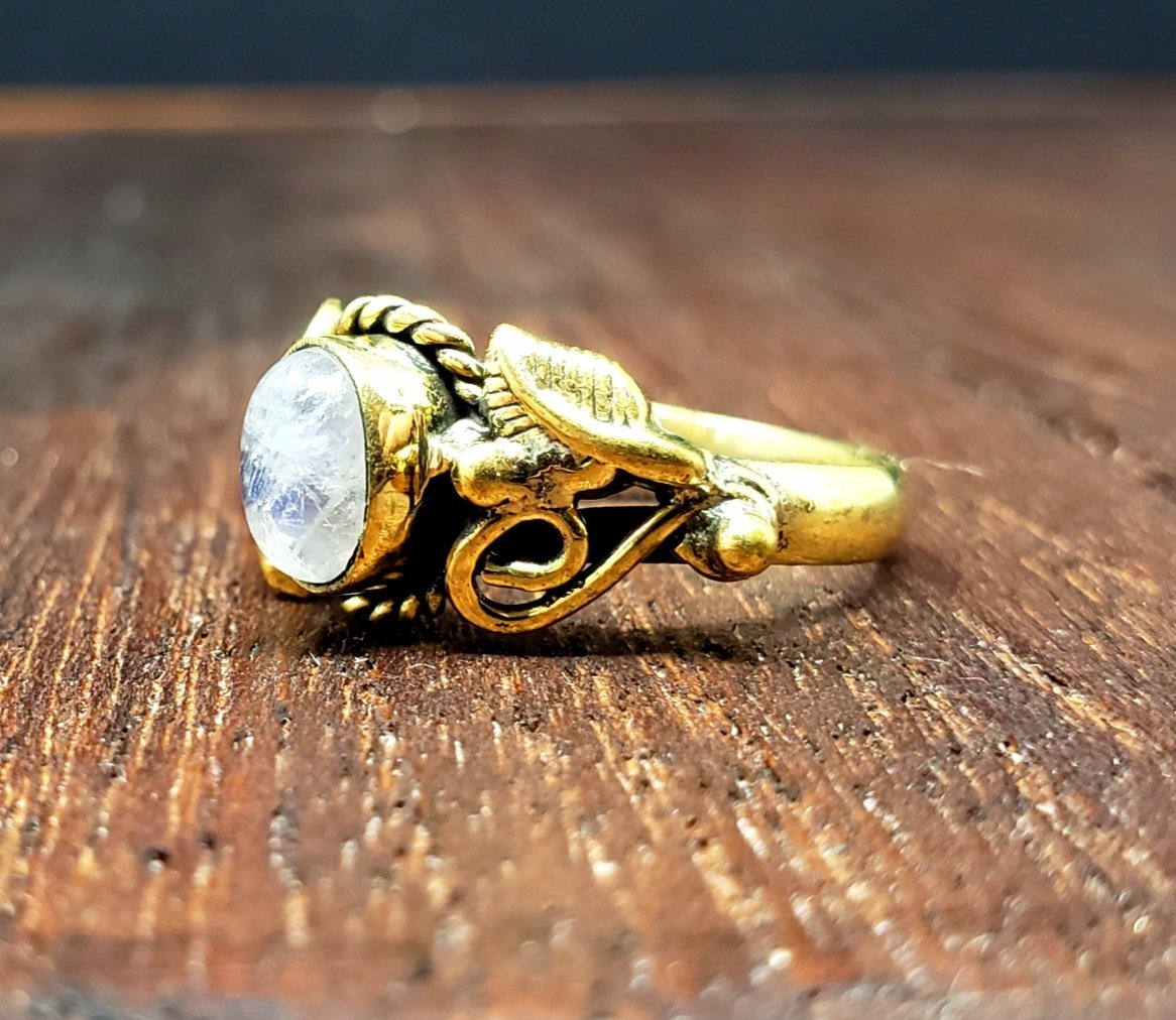 The genuine moonstone cabochon is surrounded by intricate golden leaves and swirling brass. Absolutely beautiful.