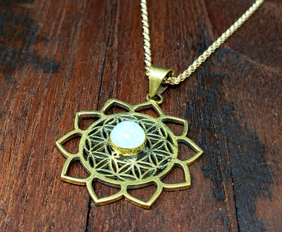 Gold Moonstone Lotus Flower of Life Sacred Geometry Pendant Necklace
