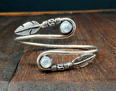 This awesome bracelet has two pieces of genuine rainbow moonstone set into a double feather design. Totally adjustable, it easily bends to fit any wrist size!