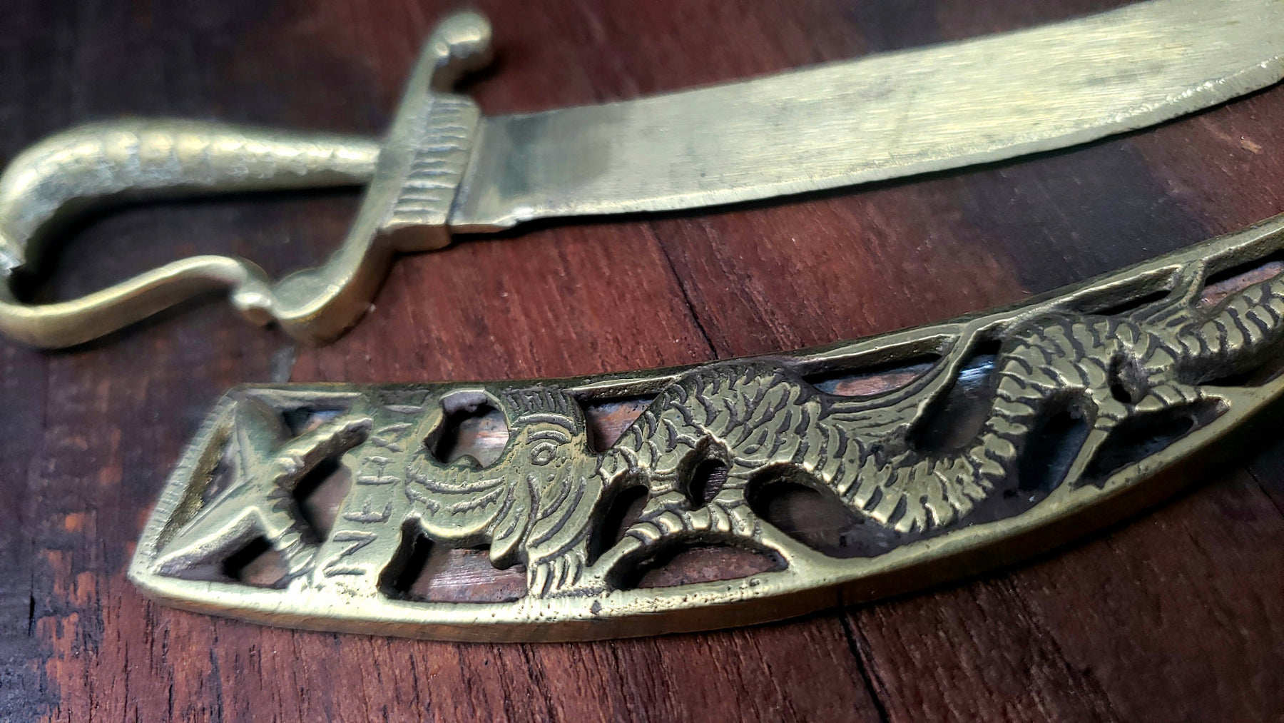 It comes with a brass sheath with a dragon and the word "Nepal" on it.