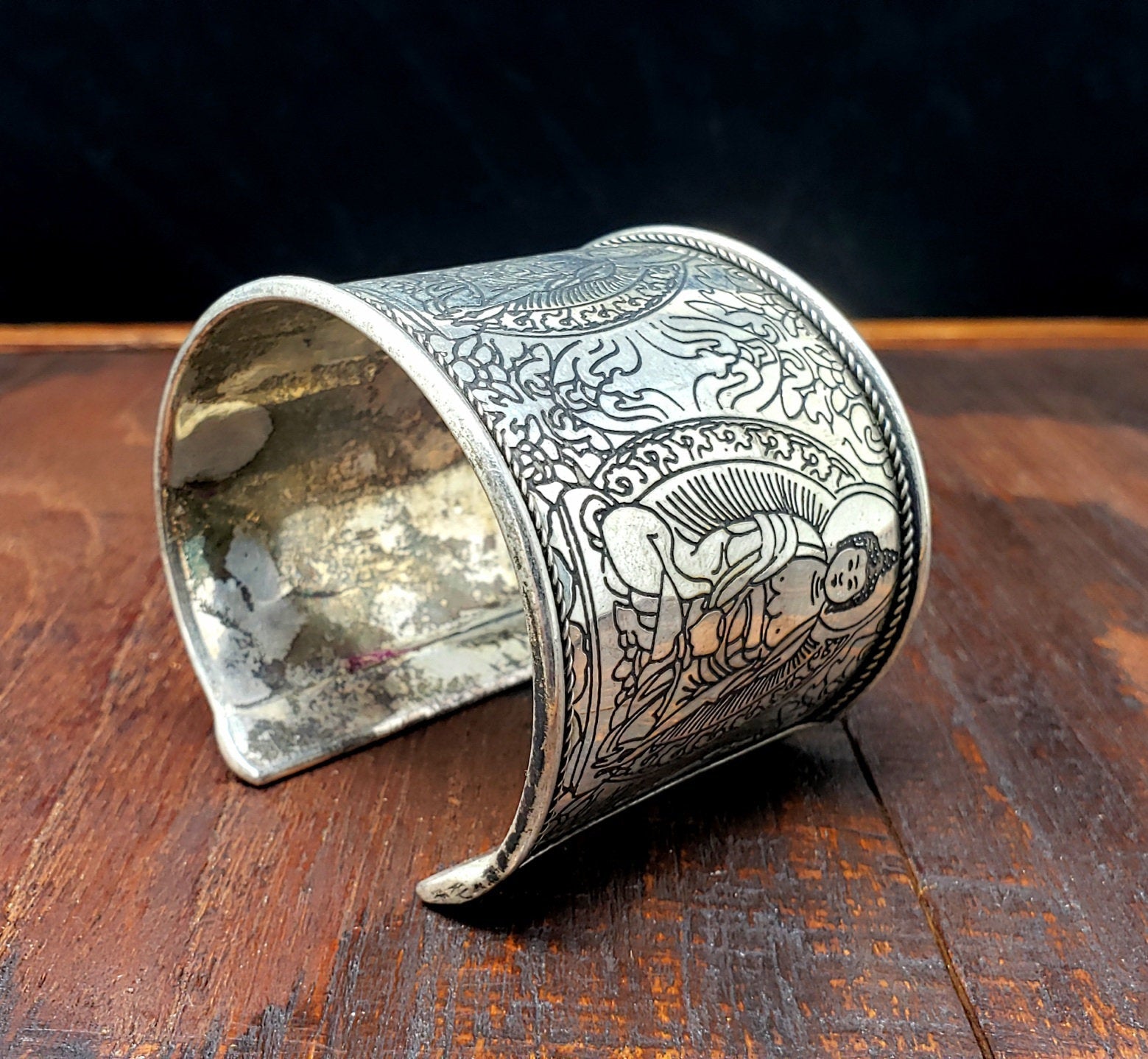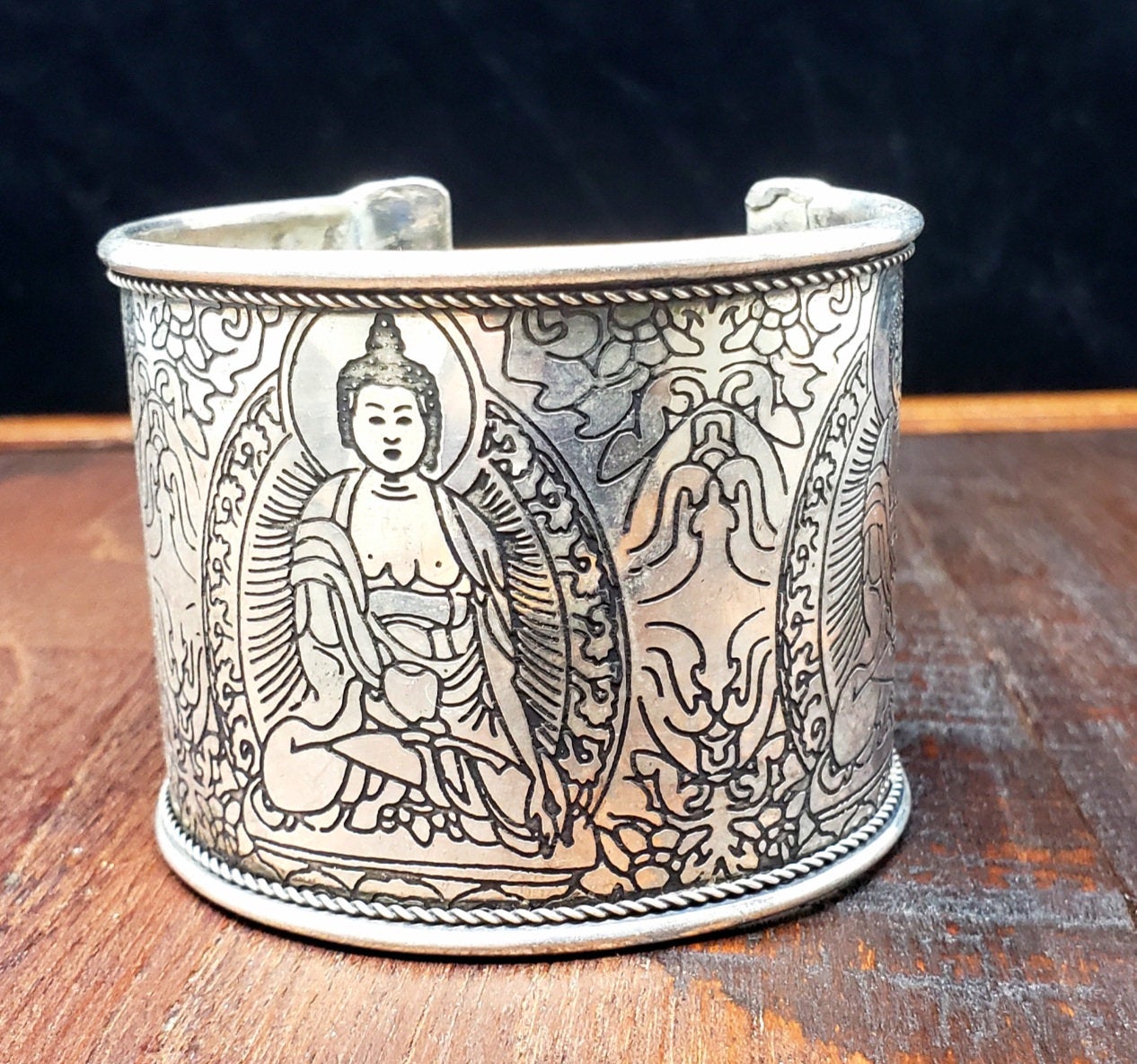 Measures 2.4" wide. Well-made to adjust to any wrist size, easily pull open and squeeze shut. The inner circumference of the piece is about 7.5" (19 cm). Made with brass.