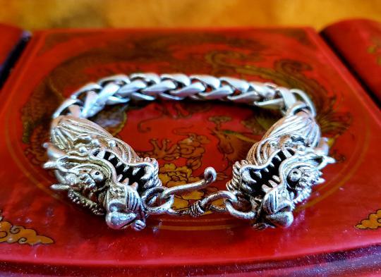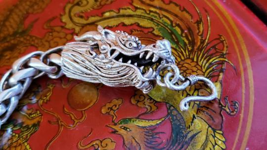 We collected this big dragon bracelet while traveling through the Hmong villages in East Asia. The dragon symbolizes power and strength, and this is certainly a very powerful bracelet!