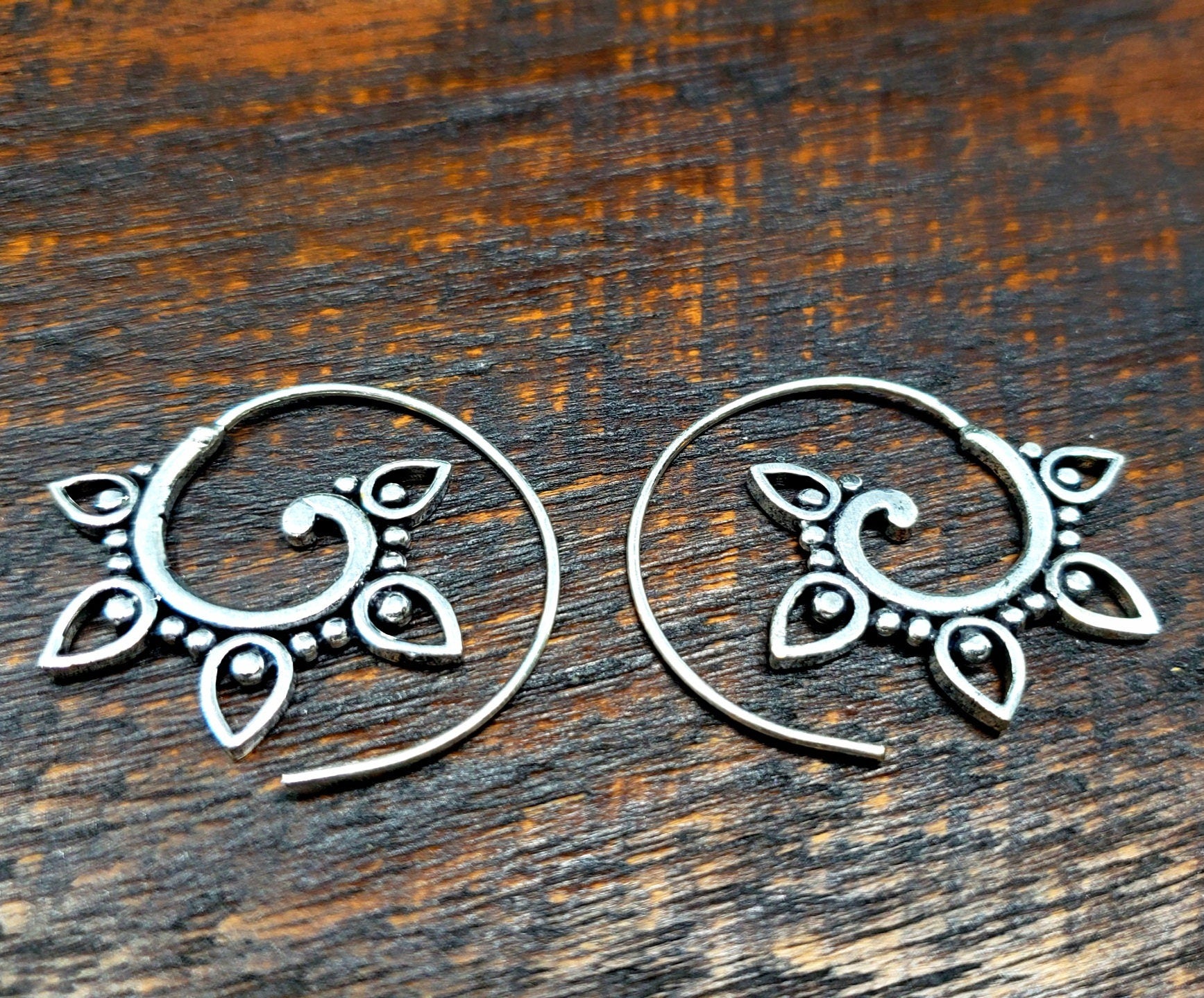These are made from brass. Thin and lightweight for daily use, they loop right in a normal piercing. They measure 1" x 1".