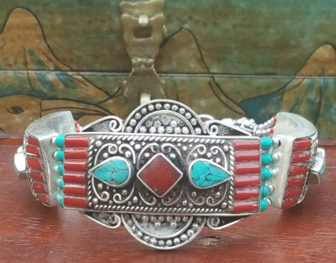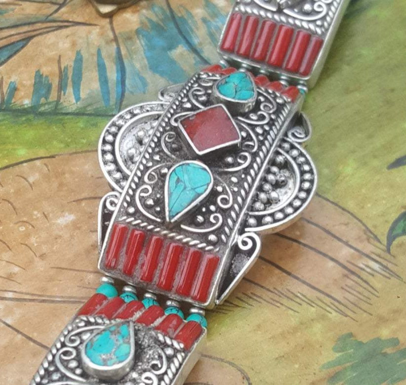 Wonderfully crafted with tiny deep red coral beads and chips of rich turquoise set into Tibetan silver (silver and brass).