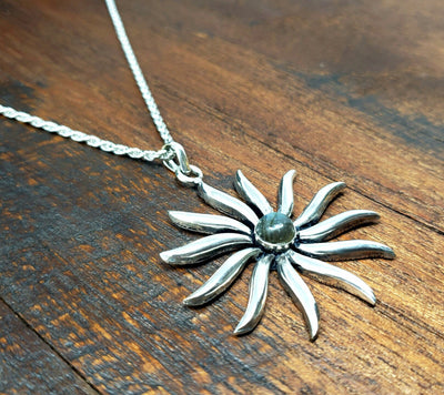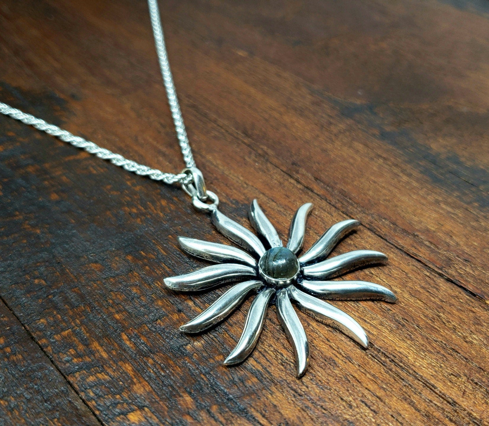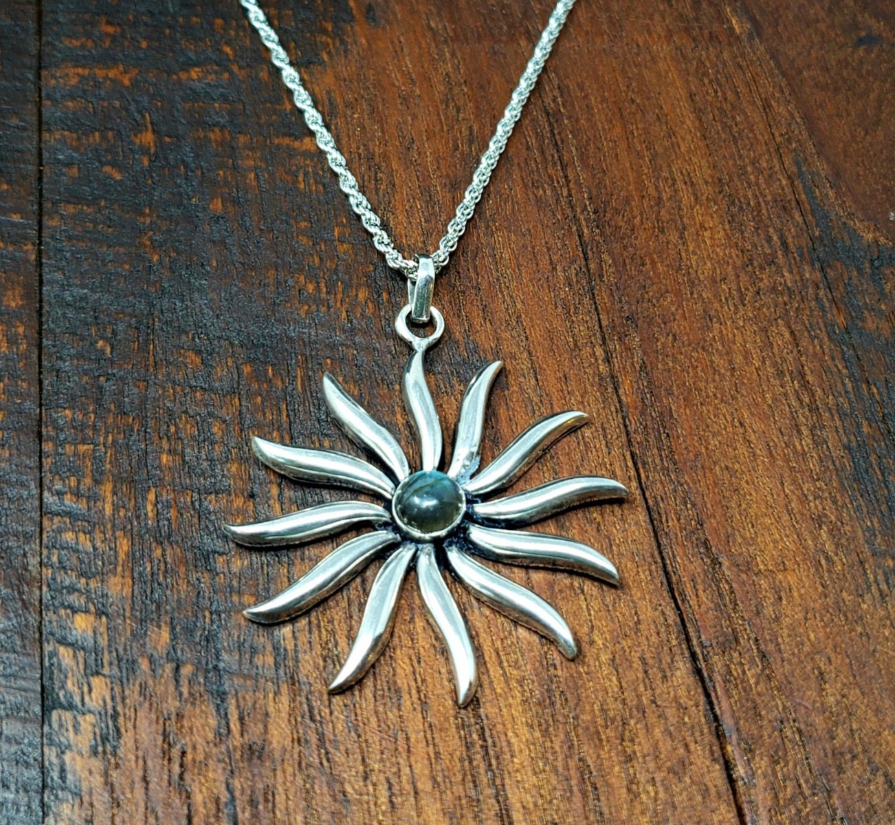 Featuring a cabochon of labradorite set into a sun design, with your choice of chain or cord.