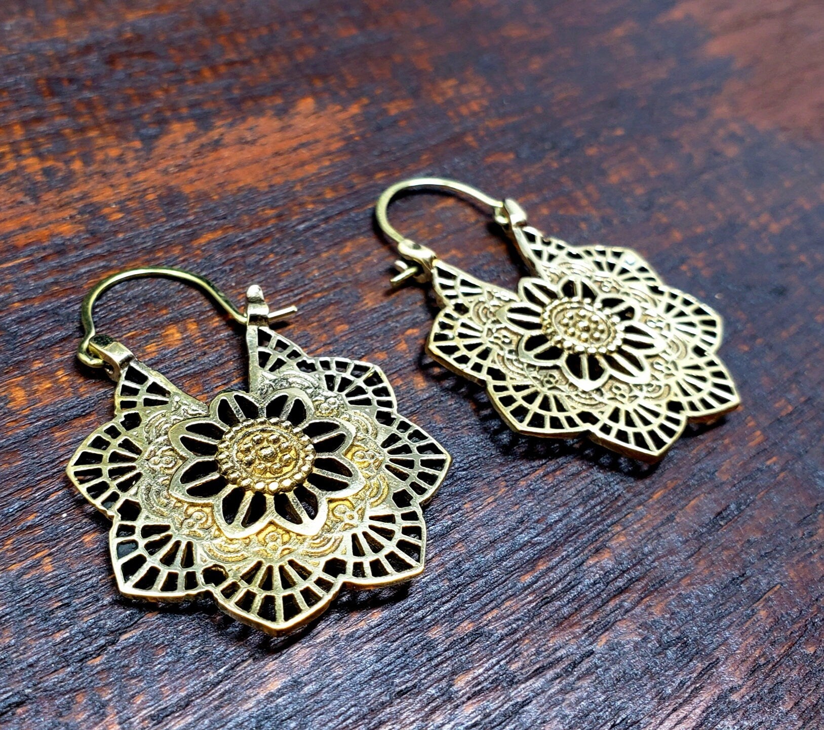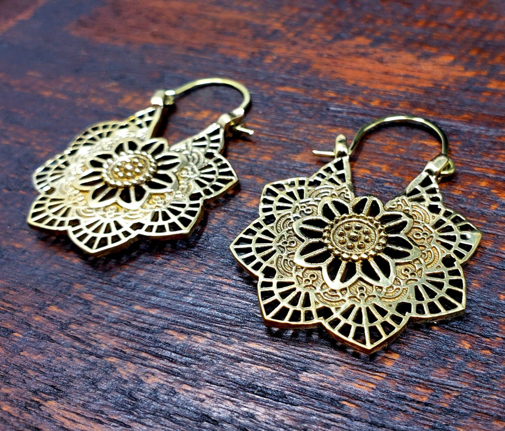 Handcrafted with high quality hypoallergenic jewelry brass. Made by hand by skilled artisans in Rajasthan, India using traditional jewelry making techniques and collected by us while traveling there. The earrings are very easy to wear, the earring hook slides in easily and attaches on the other side of the earring.