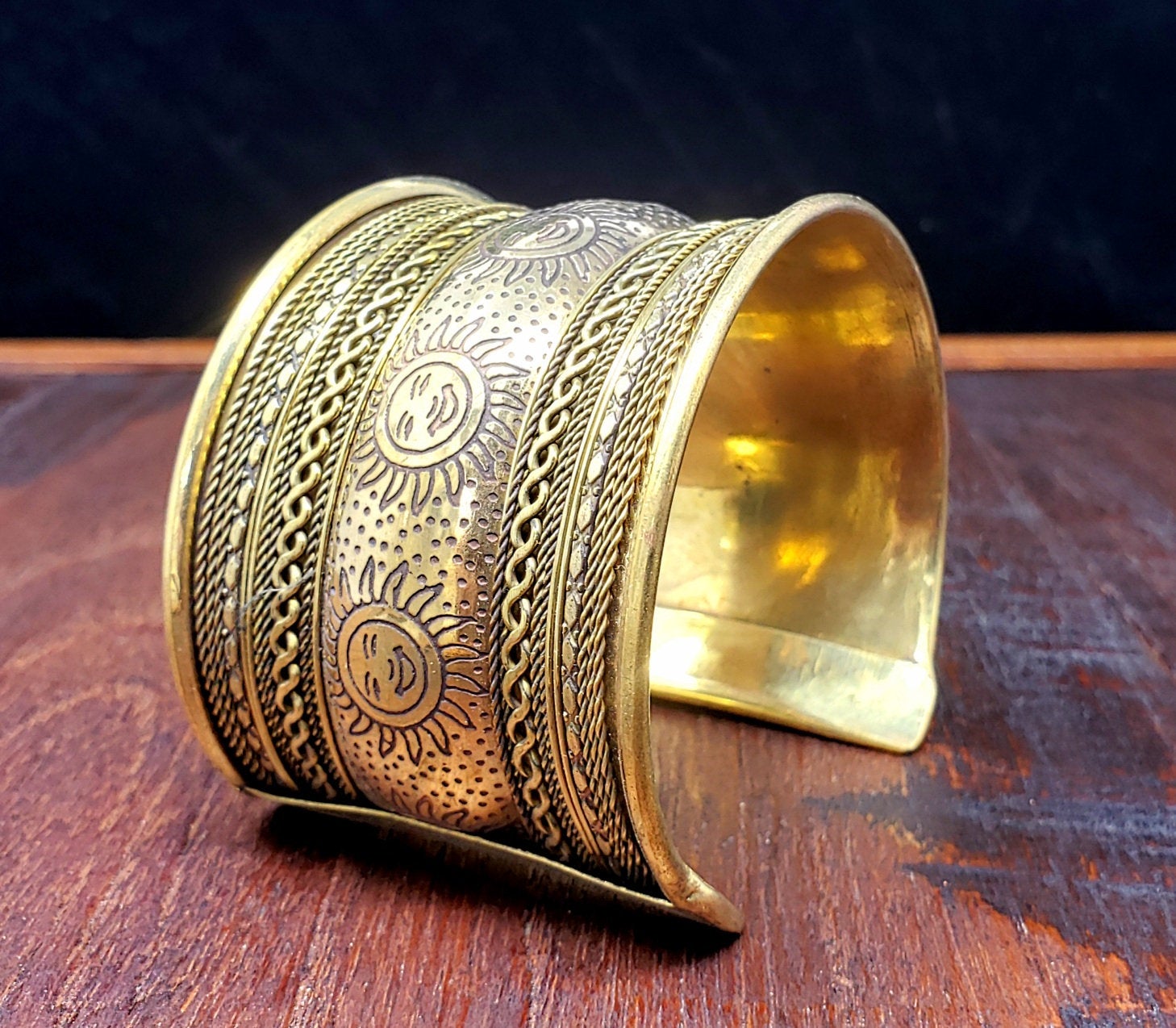Measures 2.4" wide. Well-made to adjust to any wrist size, easily pull open and squeeze shut. The inner circumference of the piece is about 7.5" (19 cm). Made with brass.
