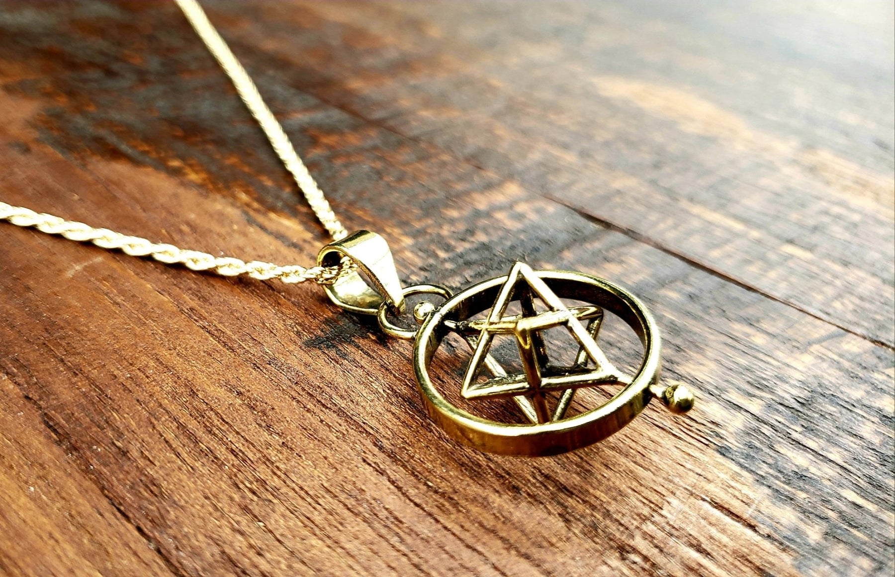 The sacred geometry star floats in the ring, spinning freely on an axis.