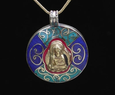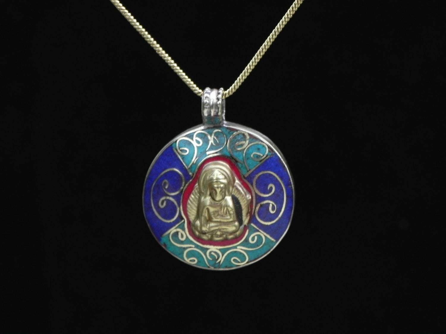 This turquoise Tibetan Buddhist shrine (Gau) pendant was collected by us from the Tibetan refugee communities in Nepal during our trip to the Himalayas. Made by hand with brass by skilled Tibetan artisans.