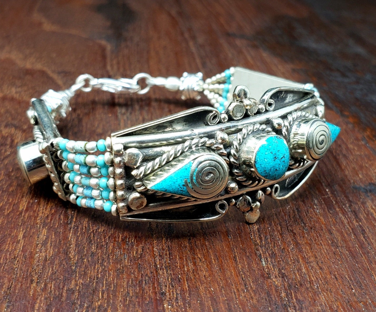 Wonderfully crafted Tibetan bracelet with tiny turquoise beads and chips of rich turquoise set into Tibetan silver (silver and brass).