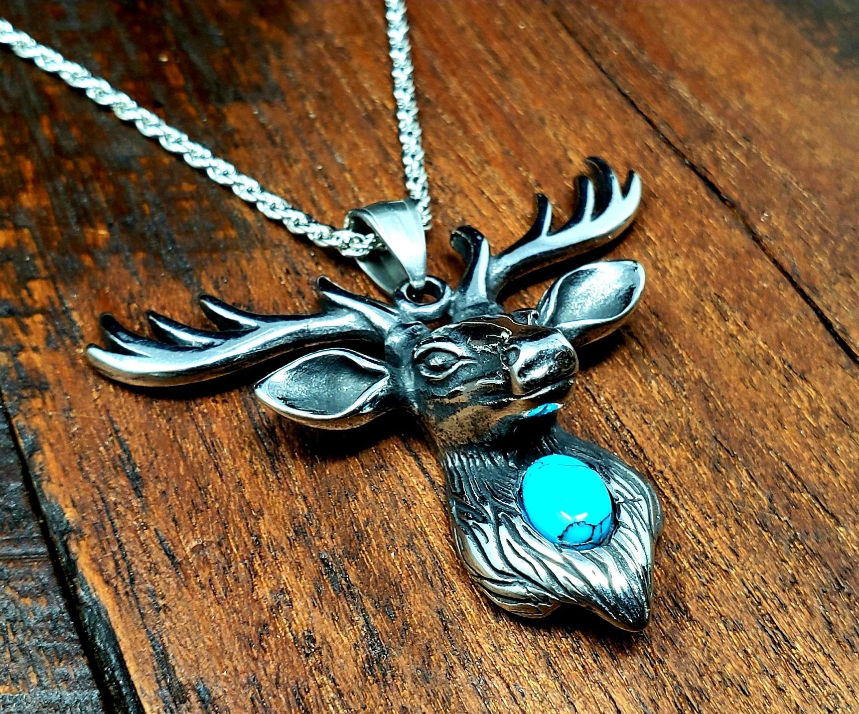The stainless steel deer includes a piece of howlite turquoise securely set into its chest. Made with stainless steel, so it will never turn or tarnish.