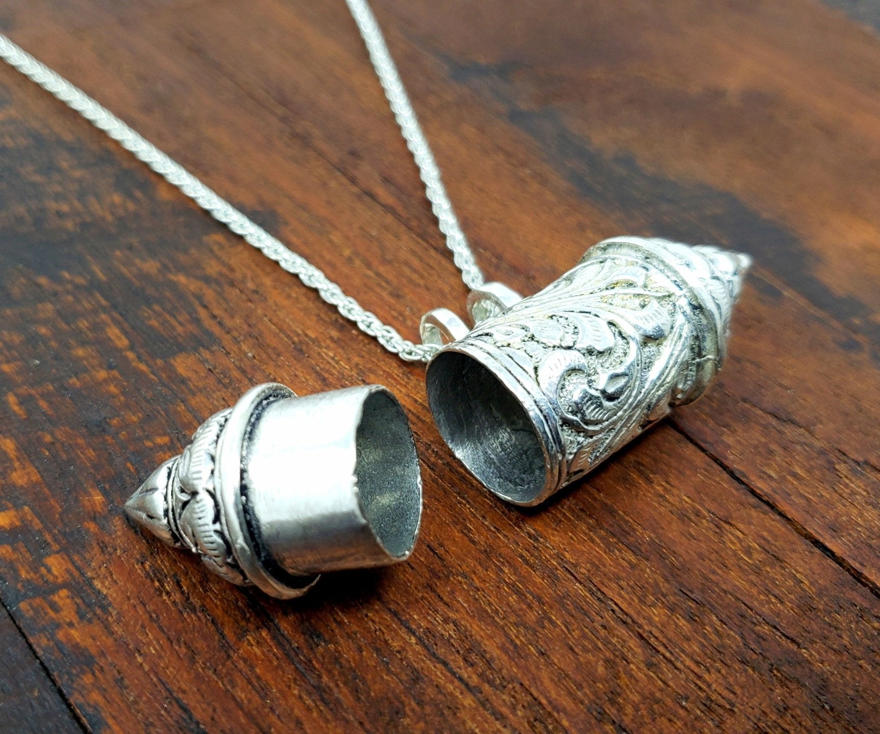 The side piece comes out, opening the pendant. The perfect place to stash something that is memorable or that is best kept hidden.
